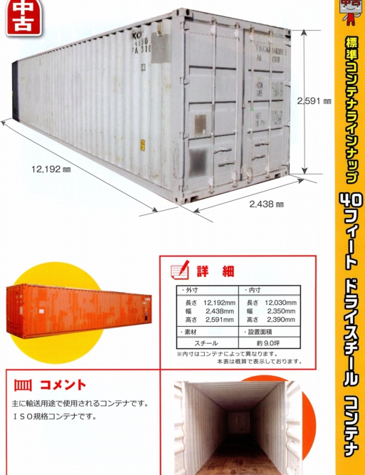 | 40フィート | 外寸 12,192mm 内寸 12,030mm |